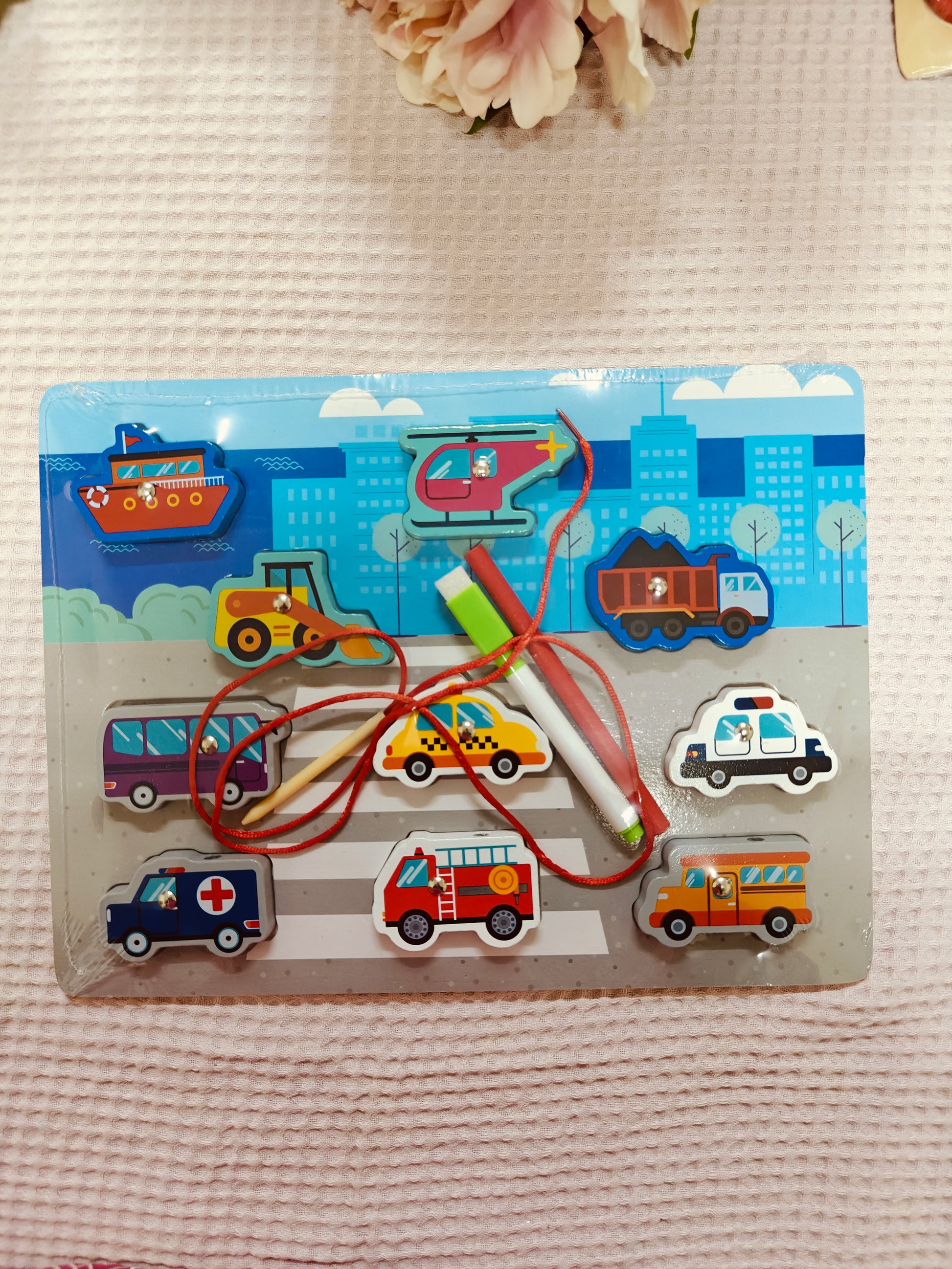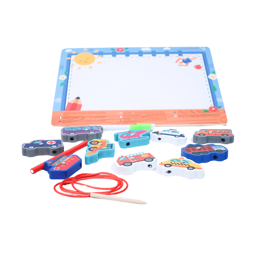 4 in 1 traffic wooden board. Threading, magnetic, sorting, white board