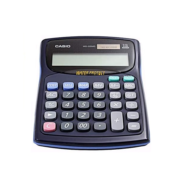 The Casio Calculator WD 220Ms is perfect for crunching numbers. It offers cost, sell, and margin calculations, tax calculations, and a 12-digit display for large numbers. It also features rubber keys, key rollover, and two-way power for reliability. Plus, it's water proof and dustproof, so you can use it worry-free.