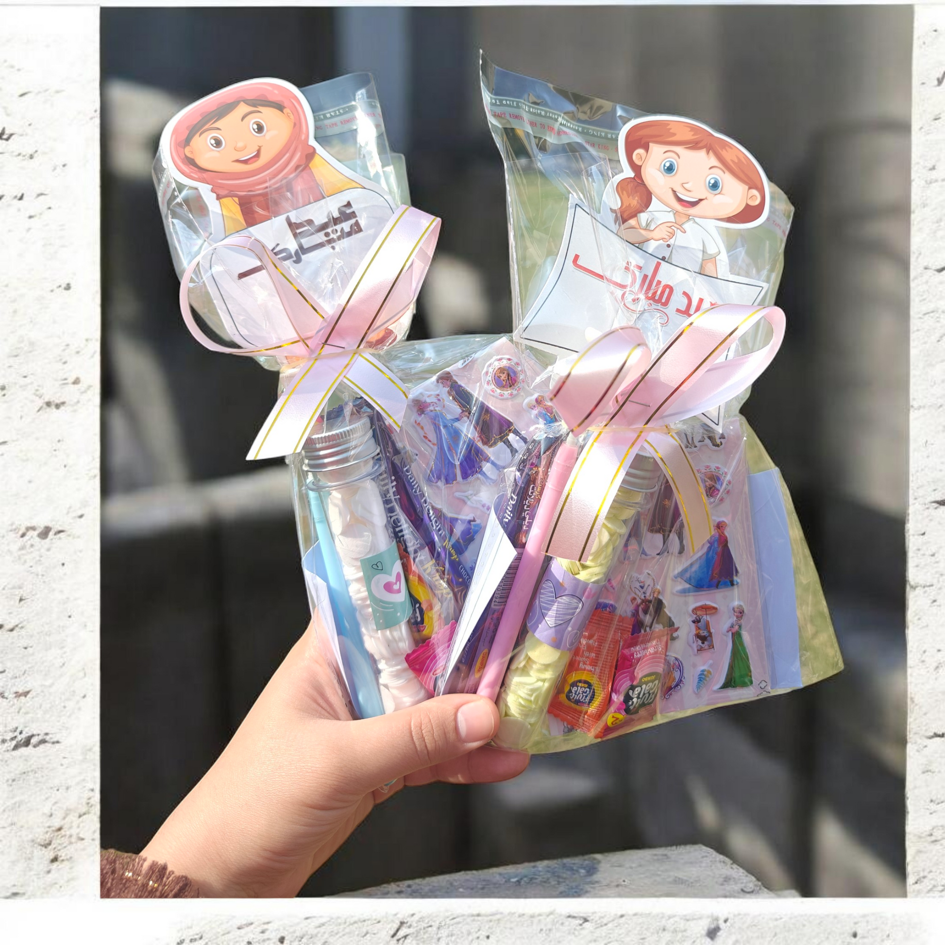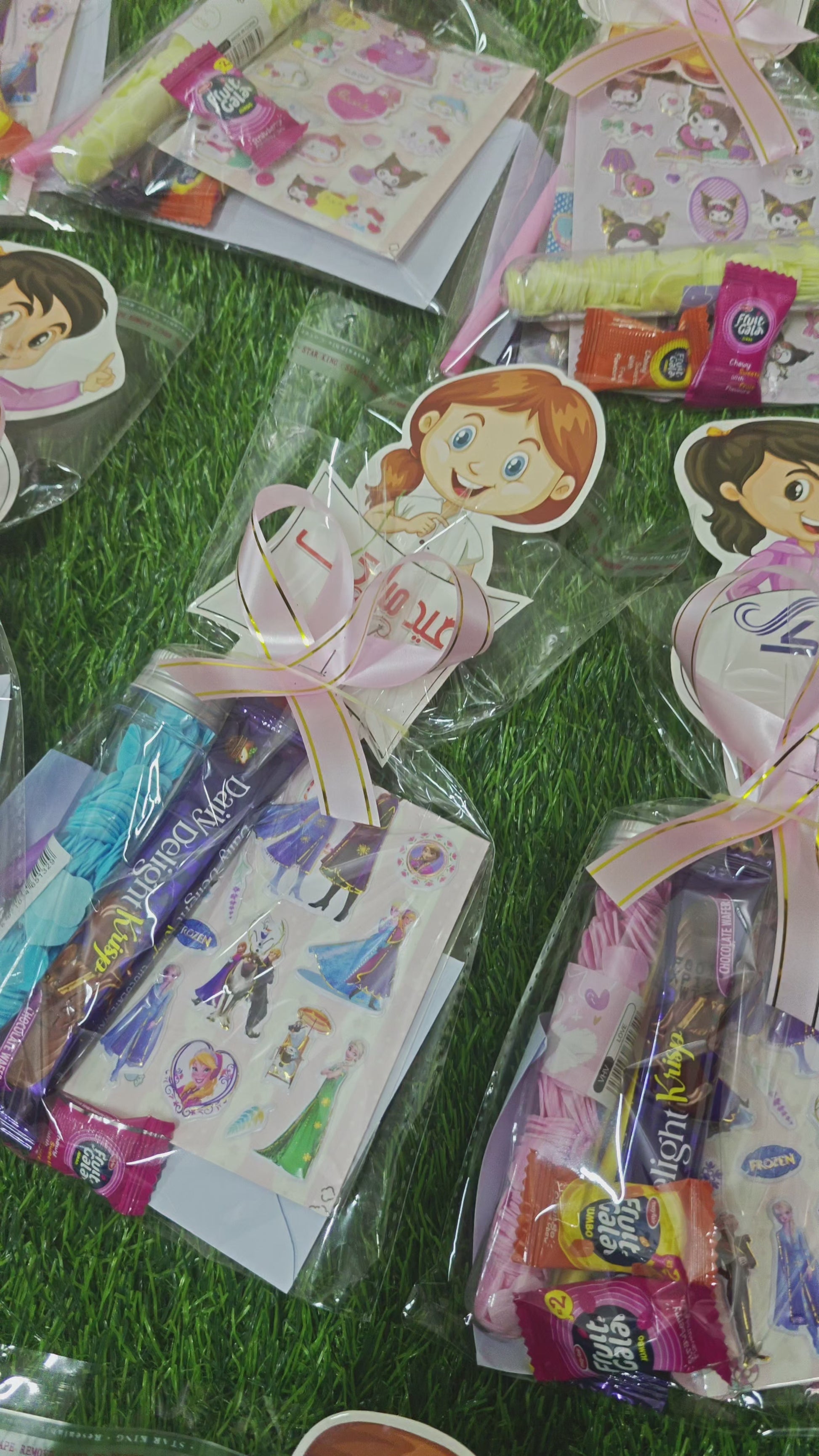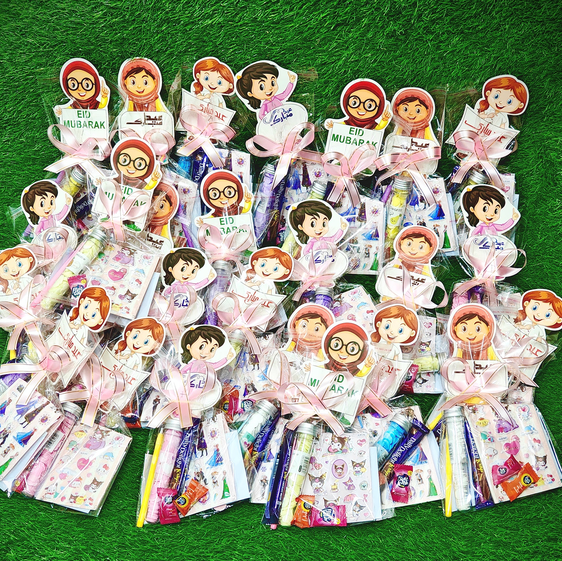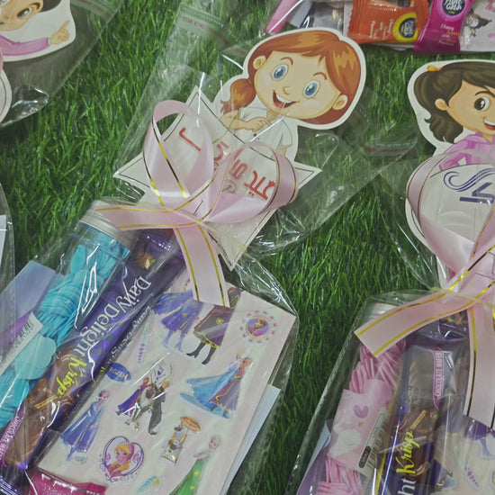 Any eidi goodie bag style of girls will include girlish colors whereas boys goodies will include boyish color things inside. Ribbons and eid cards are attached. Choclate/candies/jelly are also included .