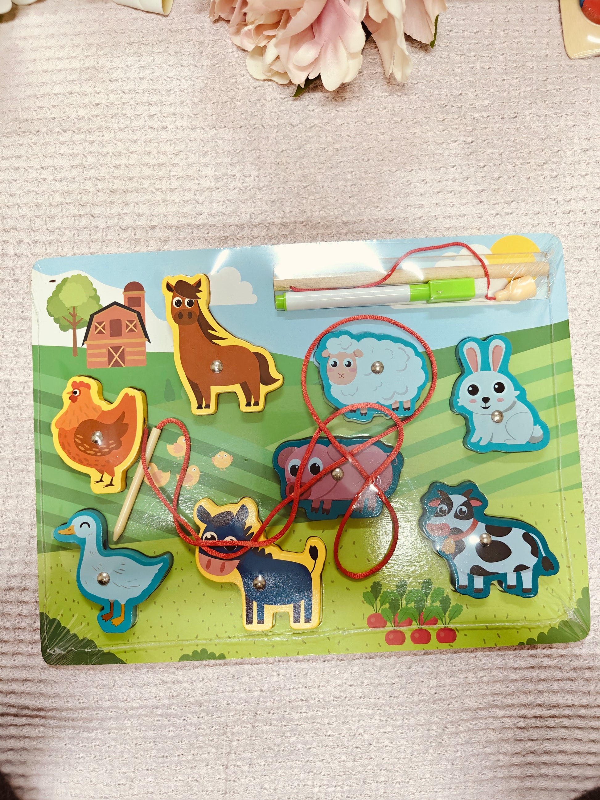 Farm animals 4 in 1 wooden board, threading, white board, magnetic, sorting