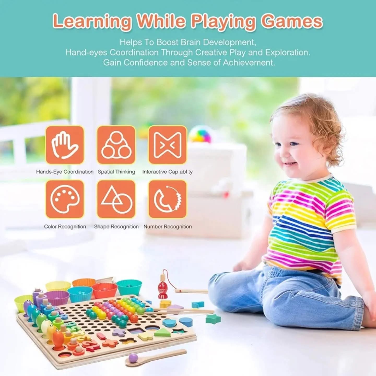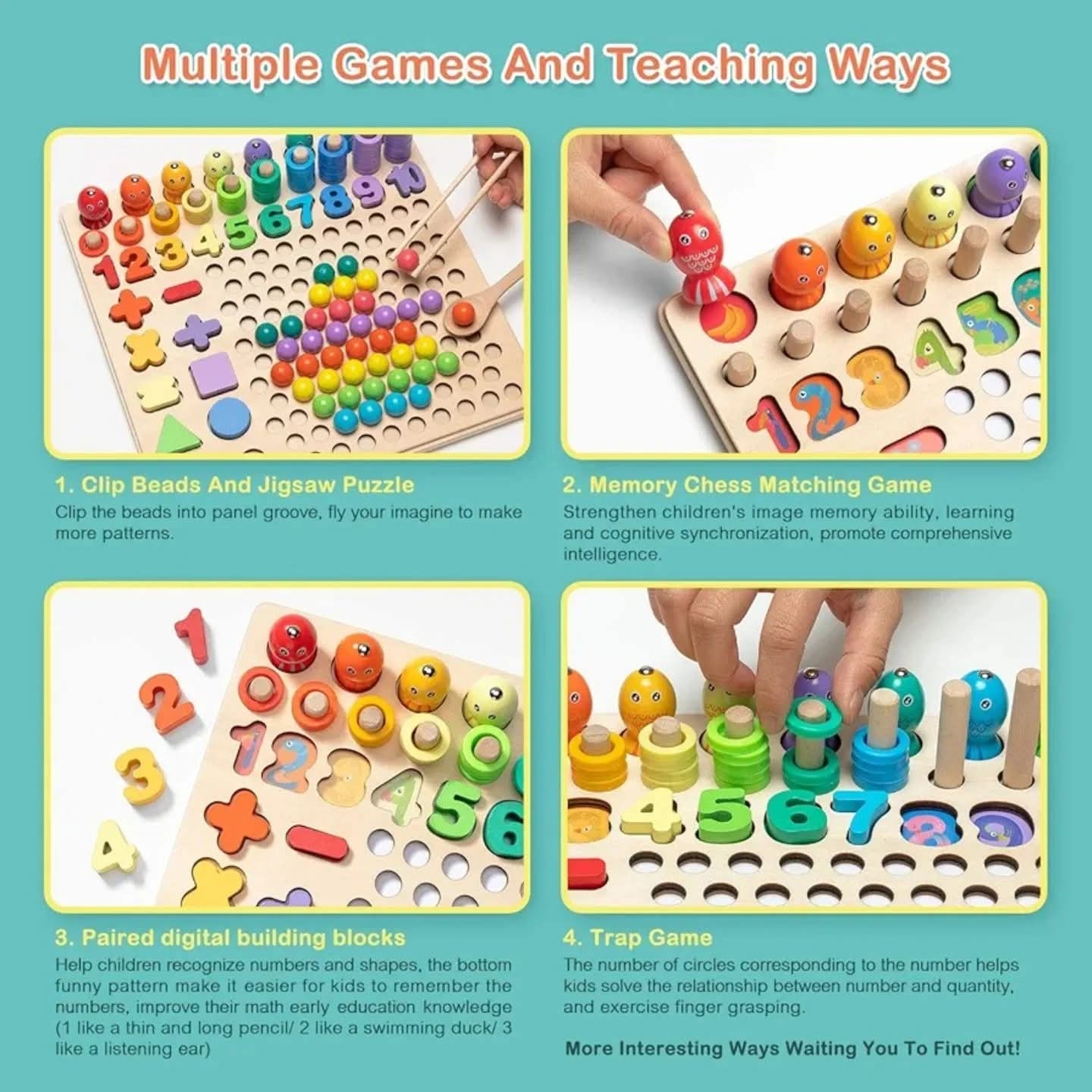 🟣Get kids away from their tablets and cell phones. Catch the right fish, figure out a math answer, sort out same beads from clutters, build patterns by stacking beads...all the games help to build close interaction and communication between parents and kids or playmates, grow parent-child intimacy.