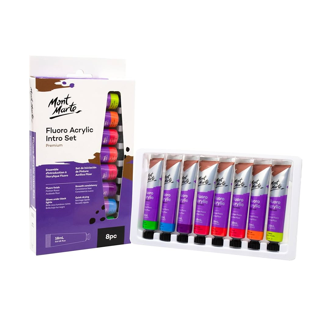 Enhance your art with the vibrant Mont Marte Fluro Acrylic Set. This set of 8 neon colors is sure to make your artwork stand out. Create bold and eye-catching pieces with ease. Perfect for artists of all levels.