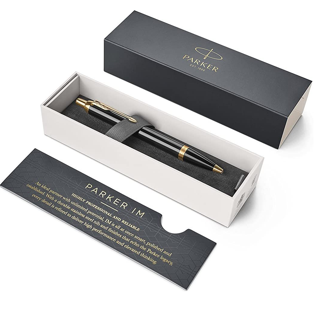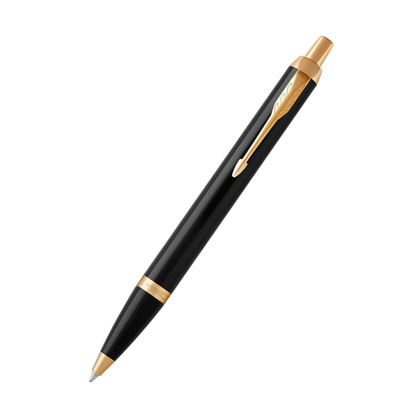 The Parker IM ballpoint pen features a sleek black lacquer body and gold trim for adding a touch of sophistication to your writing. Enjoy precision and elegance with this reliable pen that will make writing a pleasure.