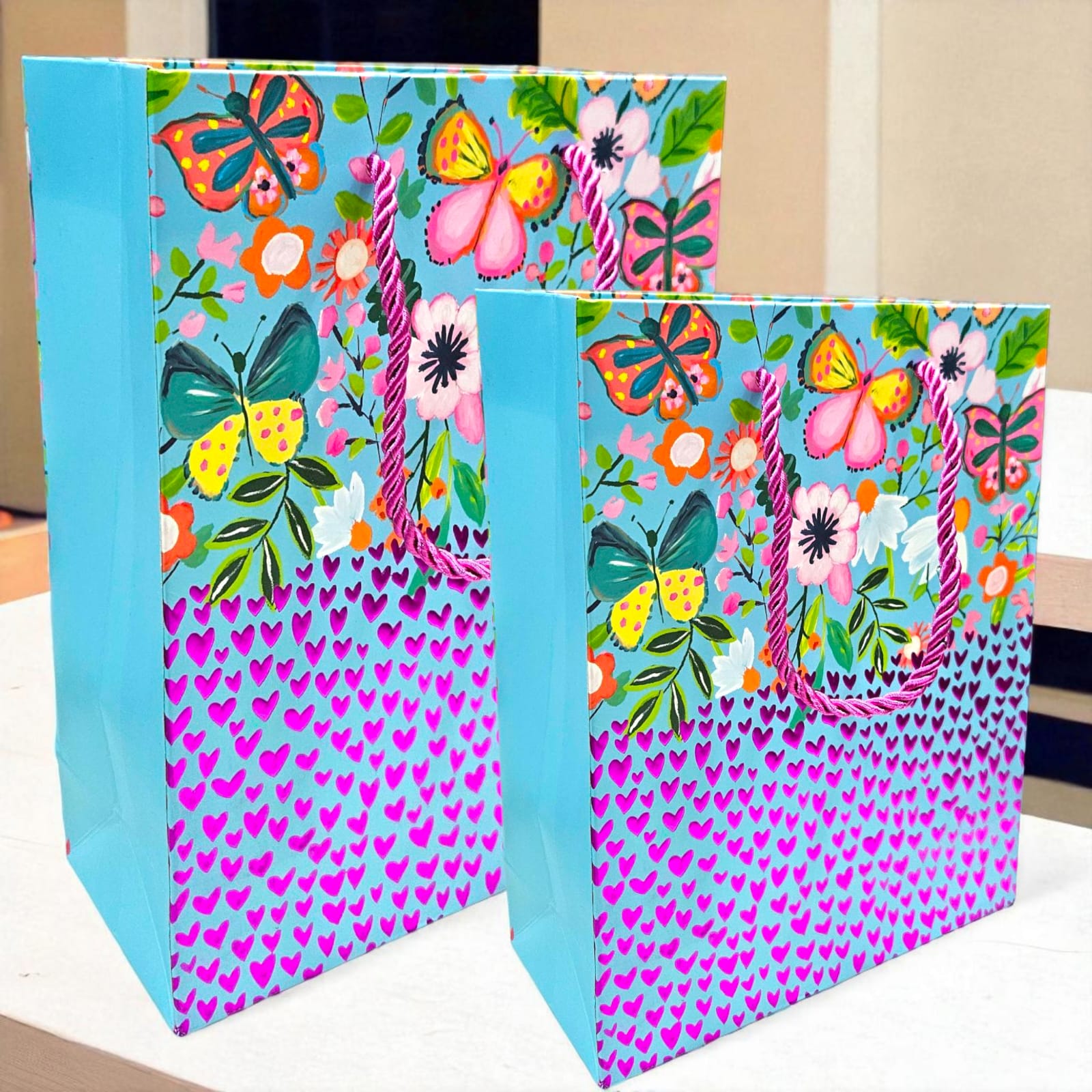 Introducing an elegant gift bag, made of imported handle dori , featuring stunning metallic pasting in emboss that showcases sophisticated and intricate designs. Ideal for adding a touch of luxury to any special occasion like birthday party, wedding, anniversary, result celebration, return party favours ,Teachers Day, father's day ,mother's Day, best friend gifts.