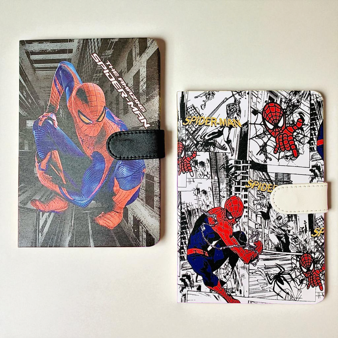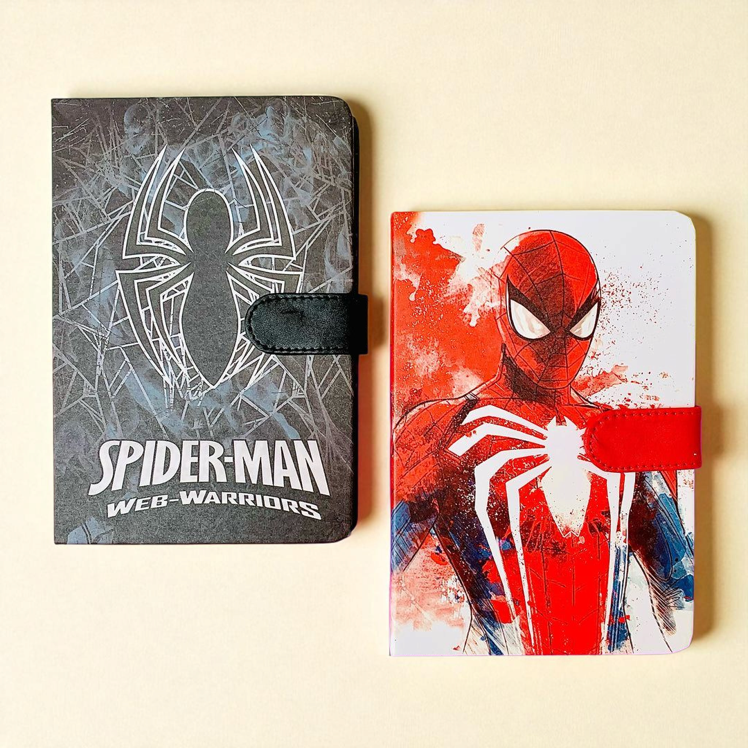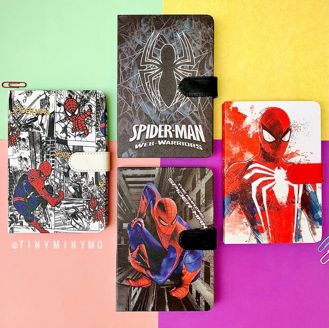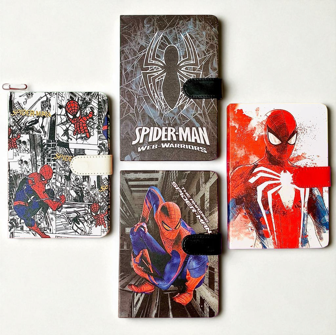 four colorful Spider-Man-themed notebooks, each with a unique and vibrant design. From classic comic book art to modern Spider-Man illustrations, these notebooks are perfect for fans of all ages. They add a fun and creative touch to everyday writing or journaling. Ideal for school, gifts, or personal use.