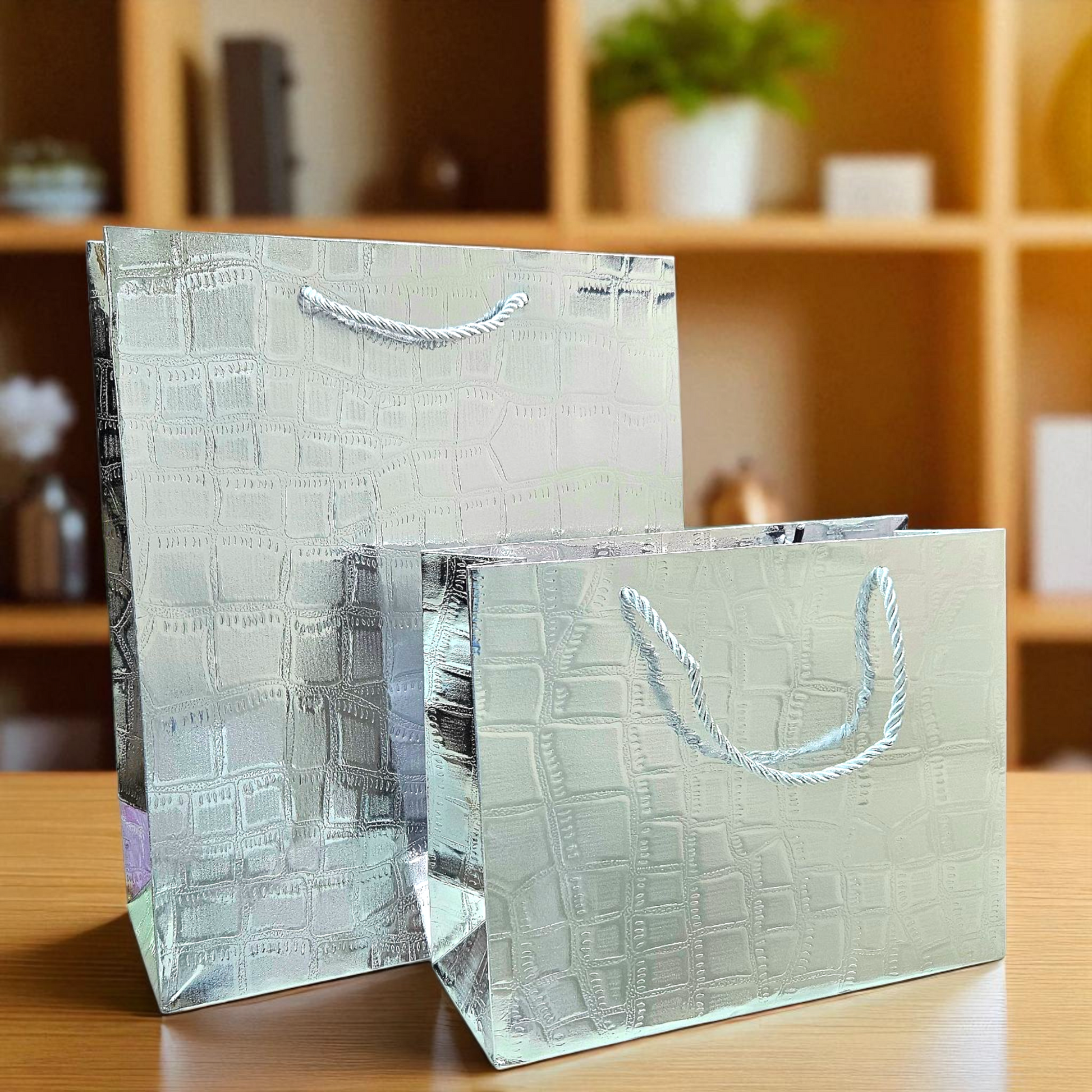 Introducing an elegant shiny gift bag, made of imported handle dori , featuring stunning metallic pasting in emboss that showcases sophisticated and intricate designs. Ideal for adding a touch of luxury to any special occasion like birthday party, wedding, anniversary, result celebration, return party favours ,Teachers Day, father's day ,mother's Day, best friend gifts.